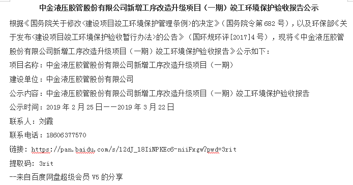 中金液压胶管股份有限公司新增工序改造升级项目(一期)竣工环境保护验收报告公示