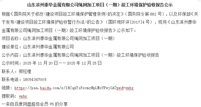山东滨州泰华金属有限公司绳网加工项目(一期)竣工环境保护验收报告公示